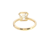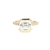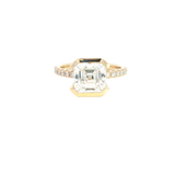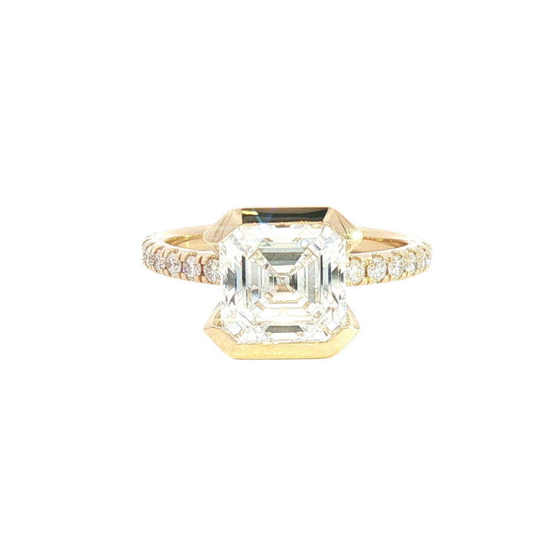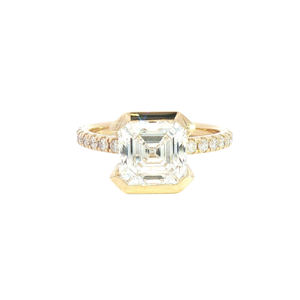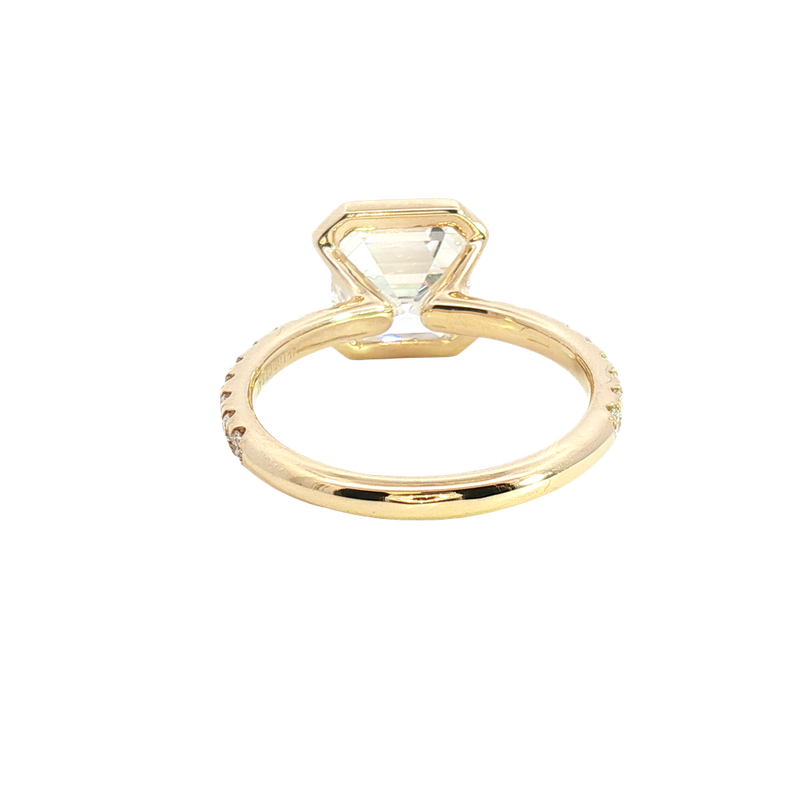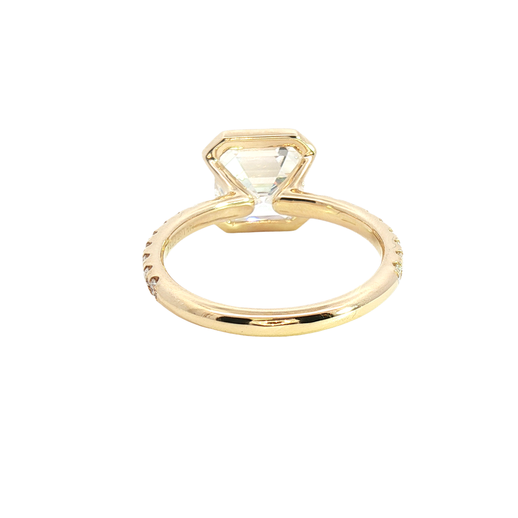 Exquisitely crafted in 14K yellow gold, this engagement ring features an Asscher cut lab grown diamond as the focal point. The step cut of the lab grown diamond enhances its geometric beauty and brilliance. A timeless design that symbolizes enduring love, perfect for making a statement. 14K yellow gold engagement ring featuring a half bezel set asscher cut diamond measuring approximately 8.1 x 8.1 mm. The band consists of high polish 14K yellow gold highlighted by nine round cut diamonds on either side of the center halfway up the shank. Total lab grown diamond weight 3.41 carats. Color E/F. Clarity VS1-VS2. Enhanced by accent diamonds totaling carats, these rings epitomize timeless romance and sophistication. Schedule a consultation to find your perfect symbol of everlasting love.