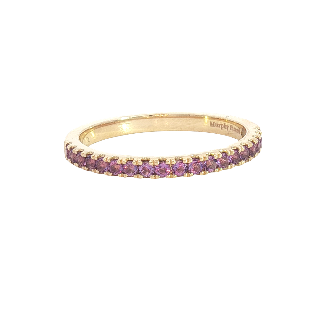This elegant eternity ring features a continuous band of sparkling amethyst. Each round brilliant cut amethyst is carefully set in lustrous 14K yellow gold. The amethysts display very good transparency, polish, and symmetry, enhancing the ring's overall brilliance. Perfect for adding a touch of timeless color to any ensemble.