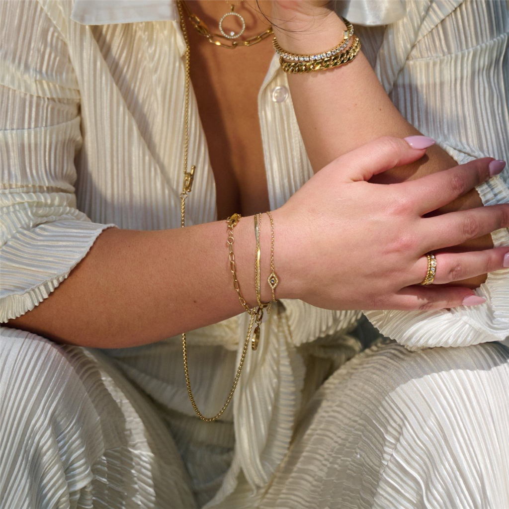 Be stylish and contemporary with our Alternative Metal Bracelets . This piece consists of a yellow gold IP stainless steel herringbone and oval chain layered bracelet with a lobster clasp and a one inch adjustment chain. Length 7.5 inches. This bracelet is perfect for adding a personal touch to your look. Crafted with a classic double design, it's a durable and versatile accessory for any occasion.