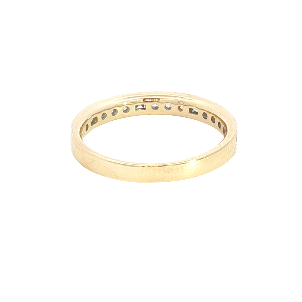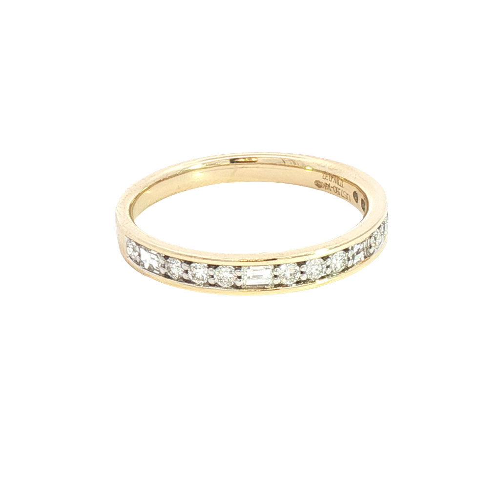 Exquisitely crafted, this 14K yellow gold eternity ring showcases a seamless circle of brilliant cut baguette and round diamonds. The continuous line of sparkling diamonds symbolizes everlasting love, perfect for commemorating special occasions or as a timeless addition to your jewelry collection. This 14K yellow gold ring features across the top of the band alternating channel set baguette cut 0.04 carats diamond by channel set round cut 0.02 carats diamonds. Total diamond weight 0.375 carats: four baguette with 0.17 total carats, eleven round with 0.205 carats total carats. Color H/I. Clarity SI2. Radiate elegance and charm with a band that celebrates timeless beauty and enduring love. Shop now to find the perfect addition to your special moments.
