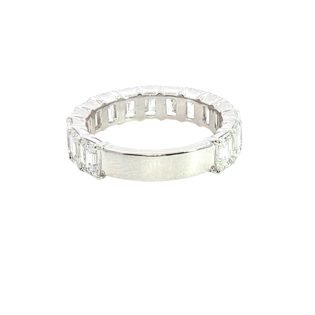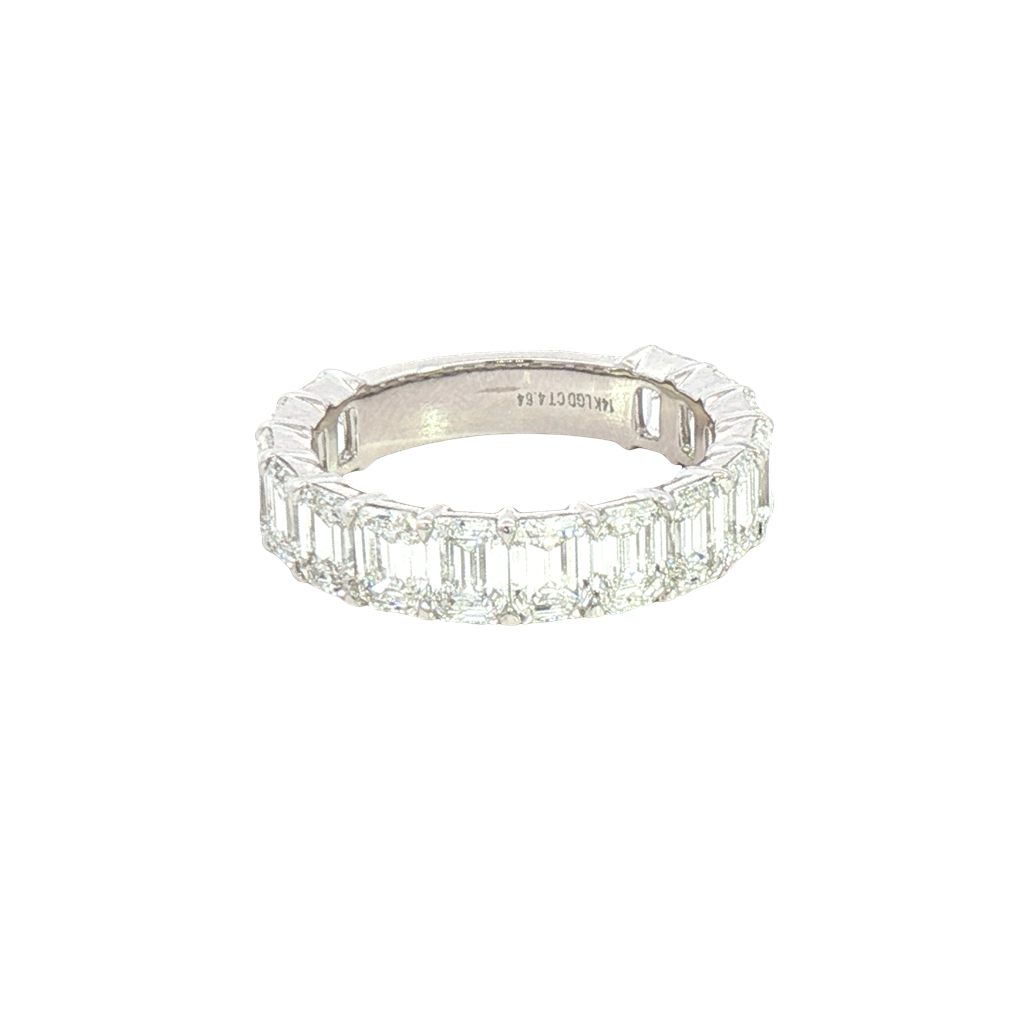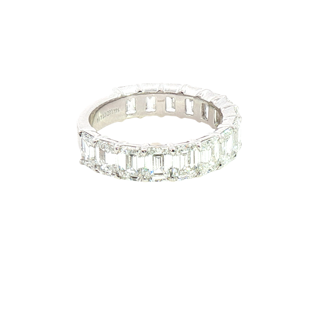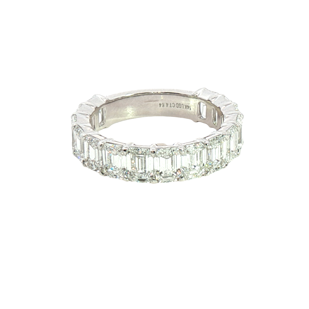 Experience timeless elegance with this exquisite 14K white gold eternity ring. Showcasing emerald cut lab grown diamonds set with single prongs setting, this piece radiates sophistication and refined style. A true embodiment of everlasting love and commitment, crafted in sleek 14K white gold. This 14K white gold eternity band features fifteen emerald cut 0.31 carat lab grown diamonds across the top three fourths of the band. Total lab grown diamond weight 4.64 carats. Color E/F. Clarity VS1-VS2. Radiate elegance and charm with a band that celebrates timeless beauty and enduring love. Shop now to find the perfect addition to your special moments.