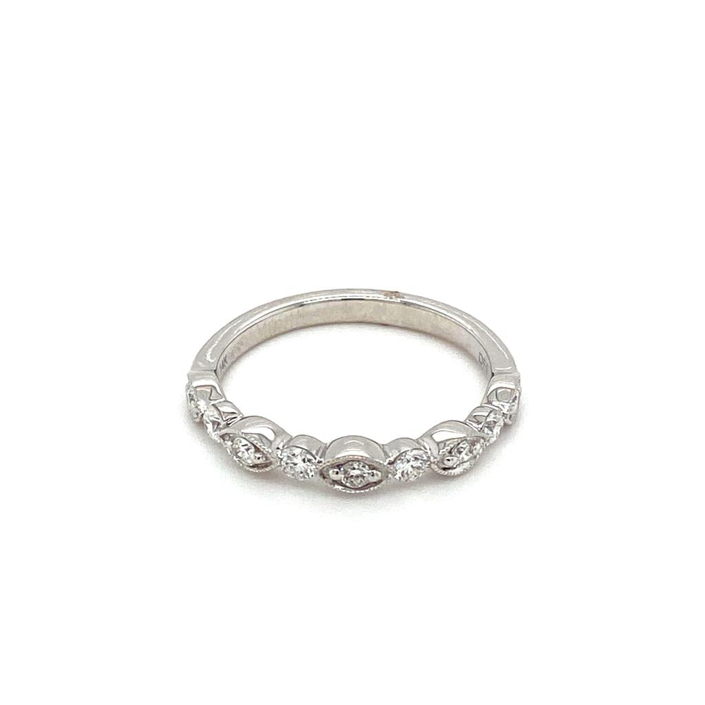 Discover the ideal symbol of everlasting love with our exquisite diamond bands. Designed to complement any occasion, this ring features a 14K white gold diamond half anniversary band with a diamond accented migraine edge marquise shape design alternating with a common prong round cut diamond. Total diamond weight .035 carats. Color G. Clarity VS2. Radiate elegance and charm with a band that celebrates timeless beauty and enduring love. Shop now to find the perfect addition to your special moments.