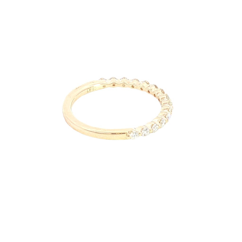 Designed to complement any occasion, this 14K yellow gold stackable band consists of fifteen round cut 0.02 carats diamonds across the top half of the band. Total diamond weight 0.34 carats. Color G. Clarity VS2. Shop now to find the perfect addition to your special moments.