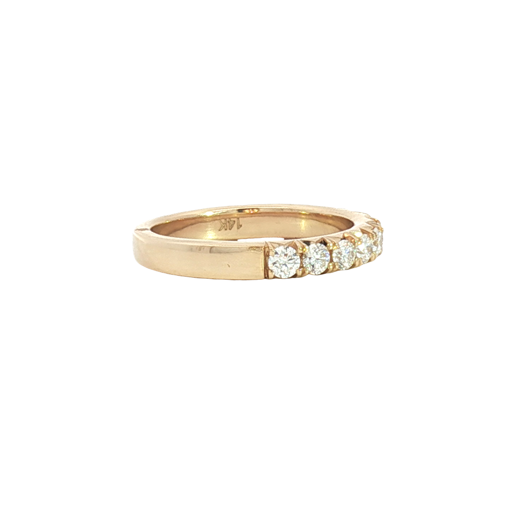Exquisitely crafted, this eternity ring features a seamless row of scintillating round brilliant cut diamonds, set in lustrous 14K yellow gold. This timeless design symbolizes everlasting love and commitment, making it an ideal piece for a wedding band or anniversary gift. The delicate warmth of the rose gold enhances the diamonds' fire, creating a stunning and sophisticated look.