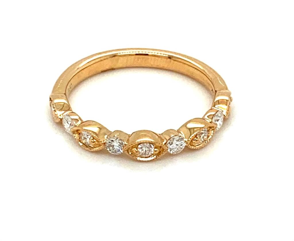 Discover the ideal symbol of everlasting love with our exquisite diamond bands. This piece consists of a yellow 14 karat gold diamond half anniversary band with a round diamond accented milgrain edge marquis shape design alternating with a common prong round cut diamond. Total diamond weight 0.35 carats. Color G. Clarity VS2. Radiate elegance and charm with a band that celebrates timeless beauty and enduring love. Shop now to find the perfect addition to your special moments.