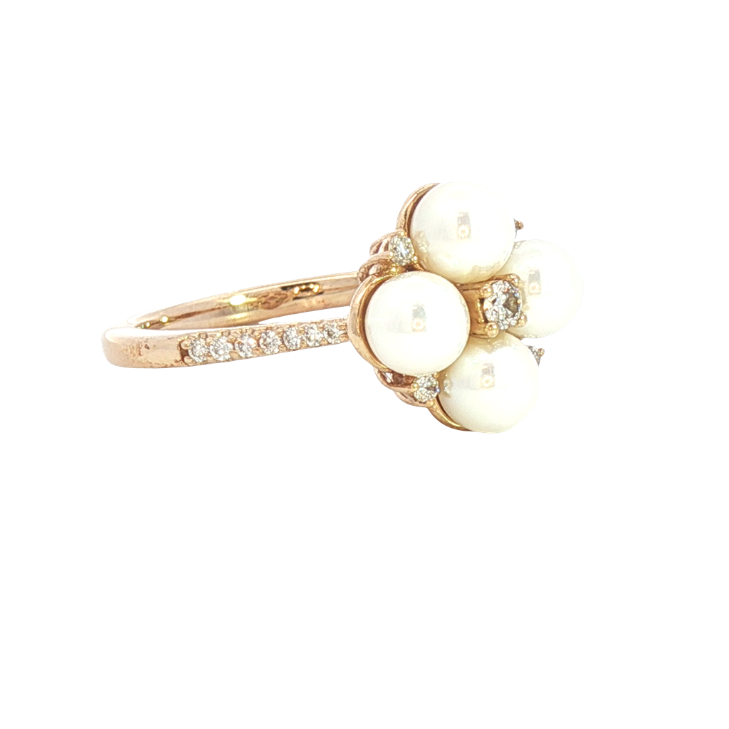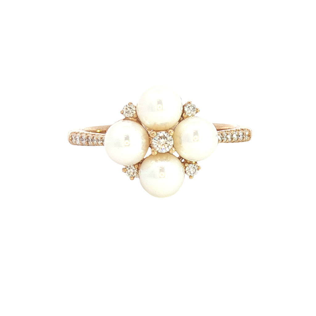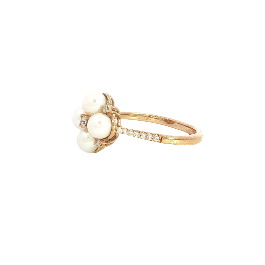 Elevate your style with this captivating cocktail ring featuring a floral arrangement of lustrous, round cultured pearls. The setting is crafted from radiant 10K yellow gold, lending a warm and romantic touch to this exquisite statement piece. Perfect for adding a touch of timeless elegance to any ensemble. This 10K yellow gold floral motif ring features four 5 mm cultured pearls highlighted by five round cut diamonds. The 10K yellow gold band is highlighted by graduating round cut diamonds halfway up the shank rising to the center. A total of four 5mm cultured pearls. Total diamond weight 0.15 carats. Color I - J. Clarity SI2 - I1. Discover your perfect pearl ring and experience the timeless allure of exquisite pearls.