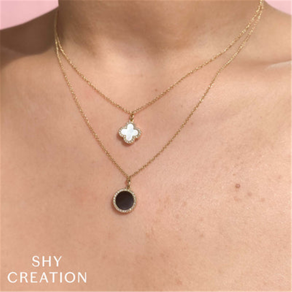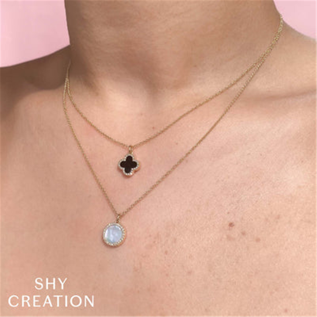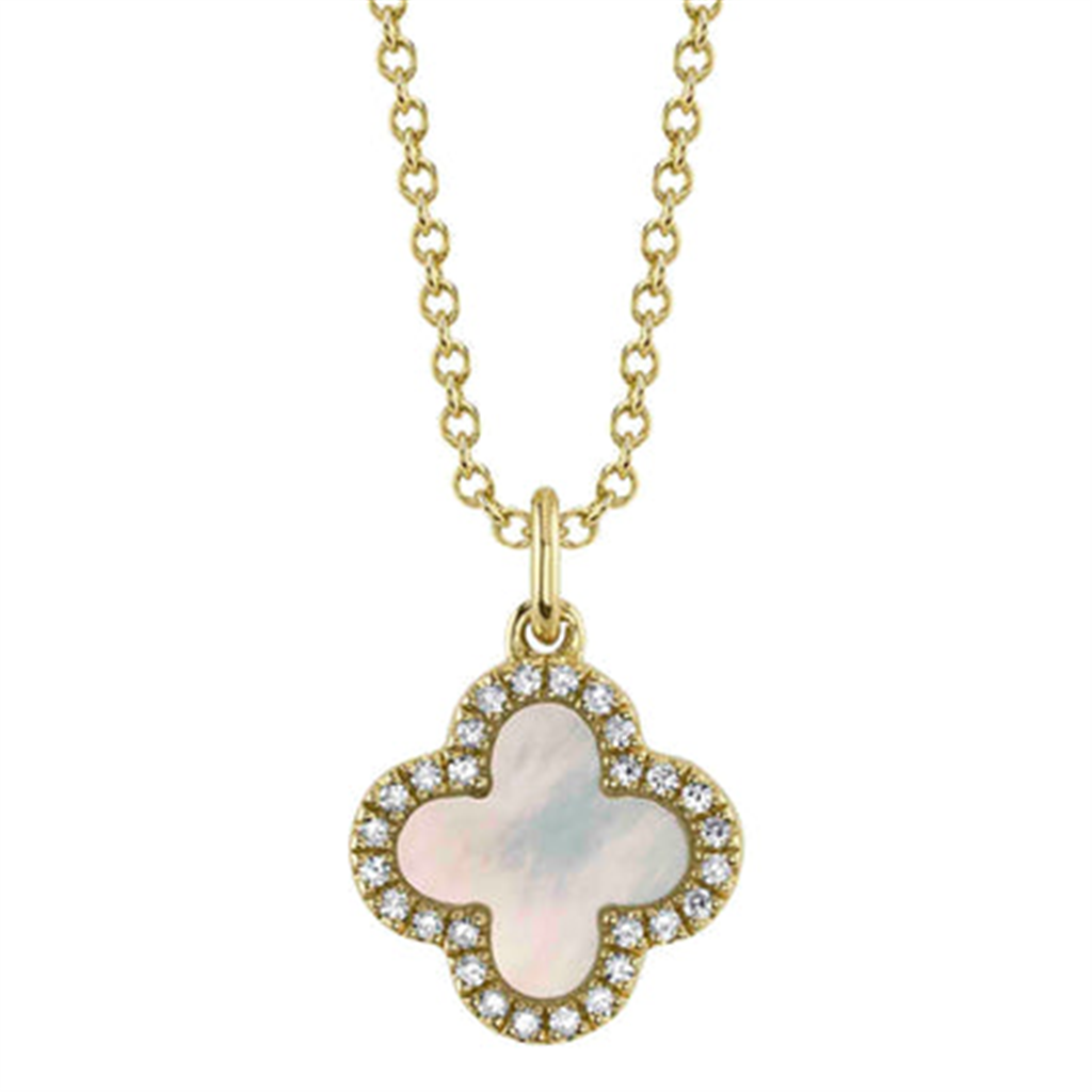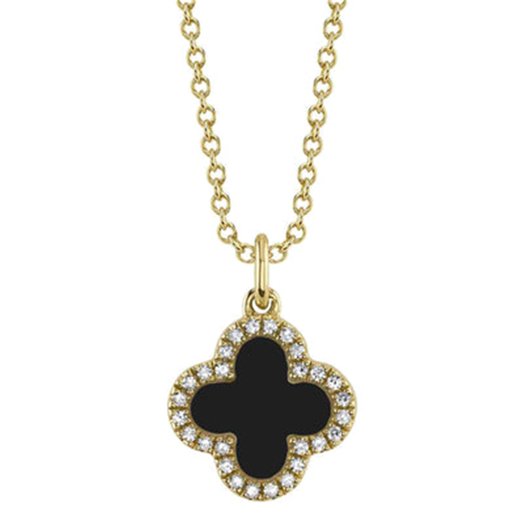 Illuminate your style with our captivating collection of color stone pendants and necklaces. This 14K yellow gold drop colored stone pendant contains a quatrefoil cut reversible black onyx and white mother of pearl edged by a single row of round cut diamonds on cable link chain with three one-inch adjustment rings and a lobster clasp. Length 18 inches. Total black onyx and mother of pearl weight 0.88 carats. Total diamond weight 0.15 carats. This piece offers elegance and playfulness. Perfect for adding a burst of color and sophistication to any outfit. Explore our collection today!